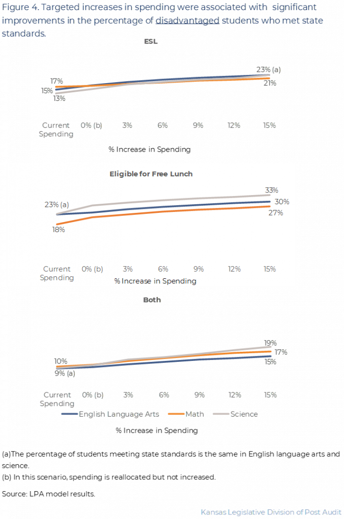The regression model implemented by LPA found that an increase in targeted per-student spending led to a 43% increase in the number of disadvantaged students who met state standards. They added that “Given the limitations of our model, we cannot determine with precision how much additional spending it might take for disadvantaged students to perform more similarly to other students. However, it is likely to be an increase in per-student spending of at least 50% (an estimated $2.2 billion)”