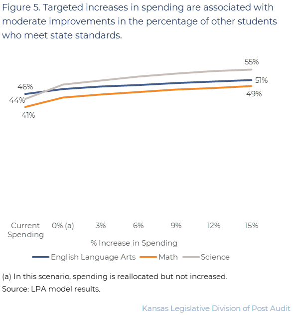 - Further, targeted increases in spending were associated with only about half of other students meeting state standards. Figure 5 shows the percentage of other students who might meet state standards under targeted spending increases. As the figure shows, the percentage of students who meet state standards improved in all 3 subjects. However, about half of these students still do not meet state standards.