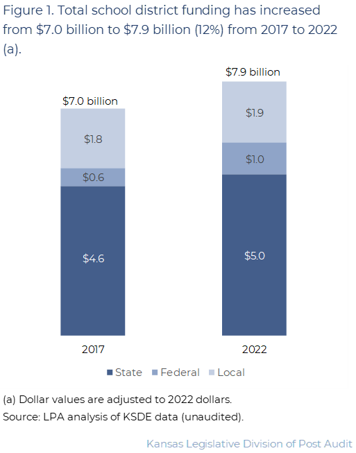 In 2022, Kansas school districts received $7.9 billion in funding from state, local, and federal sources, up 12% from 2017.