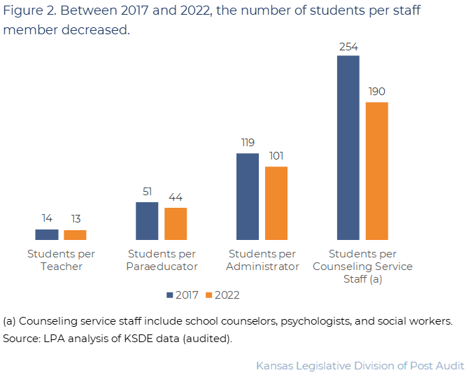 - From 2017 to 2022, the number of school district staff increased (from 68,000 to 73,000) although the number of students decreased. This resulted in a decrease in the number of students per staff member. Figure 2 shows the changes in students per various types of staff. As the figure shows, students per teacher changed slightly (from 14 to 13). However, the number of students per counseling service staff member declined more significantly (from 254 to 190). In some cases, a declining number of students per staff can be a positive trend because it means staff have more time to devote to each student.