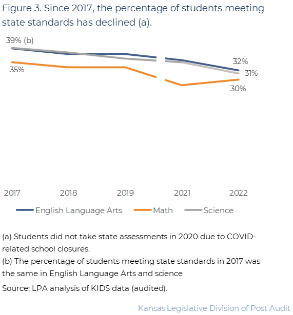 - We used Kansas student assessment scores from 2017 to 2022 to evaluate how many students might meet state standards. We included three subjects in our analysis (math, English language arts, and science). Although students take a social studies assessment, the test was changed recently and could not provide a long-term comparison. We only used state assessment scores since 2017 because 2017 was the first year that students started taking the current state assessment.