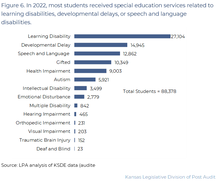 - In the 2021-22 school year, districts provided special education services to about 88,400 students. Figure 6 shows the number of students who received special education services in 2022 by exceptionality. As the figure shows, in 2022, most students received services related to learning disabilities, developmental delays, or speech and language disabilities.