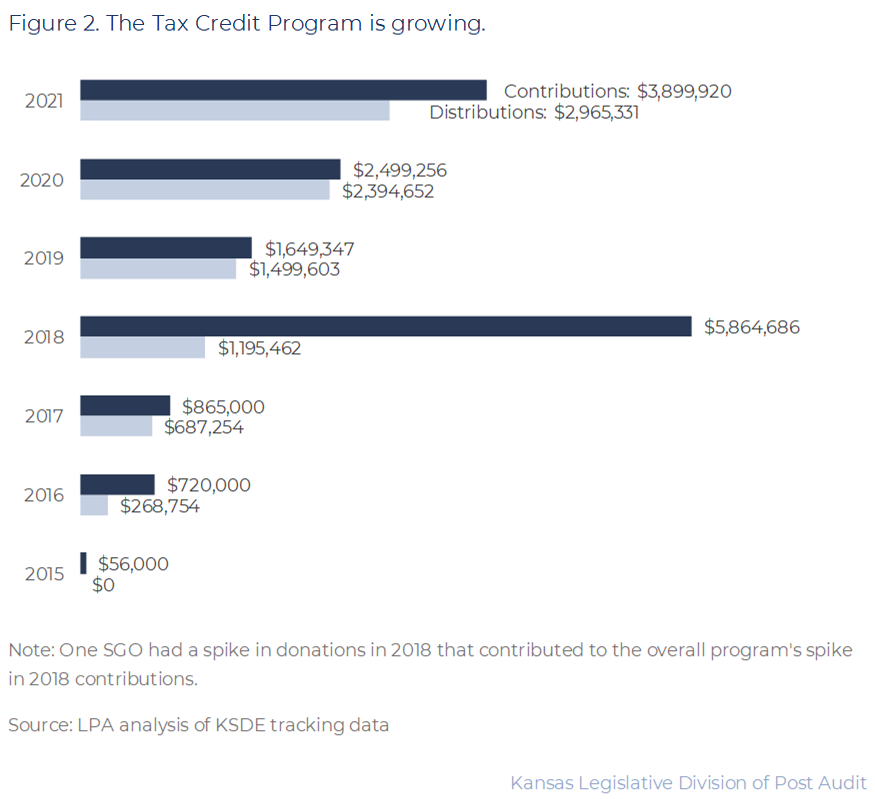 The scope of this audit was limited to contributions to and distributions from the Tax Credit for Low Income Student Scholarship Program. To answer this question, we talked to officials from the Kansas Department of Education (KSDE) and Scholarship Granting Organizations (SGOs). We reviewed and analyzed annual contribution and disbursement information KSDE collected from 2015-2021. Lack of exact contribution and disbursement dates limited our work. Finally, we reviewed SGOs’ CPA audits on file with KSDE for the period from 2015-2020 for certain statutory compliance concerns.