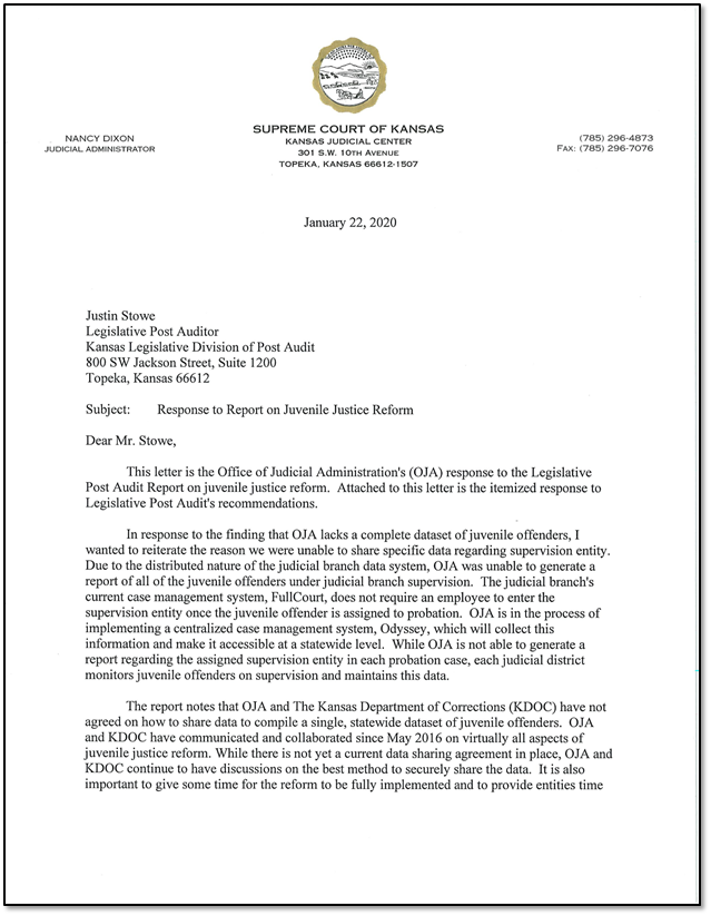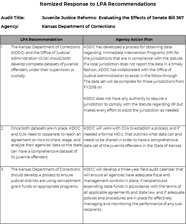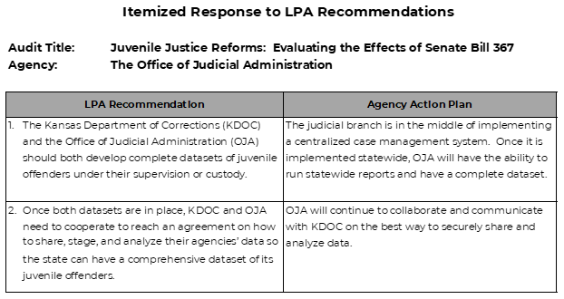 - The Kansas Department of Corrections (KDOC) and the Office of Judicial Administration (OJA) should both develop complete datasets of juvenile offenders under their supervision or custody.