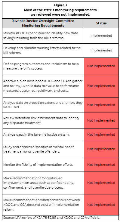 - State law did not specify a timeline for the monitoring requirements. The reforms represented a large and complicated transformation of the state’s juvenile justice system. KDOC and OJA officials told us the committee’s focus in the first few years was on implementing the reforms. They told us the committee should be able focus more on monitoring the effectiveness of the reforms in the future.