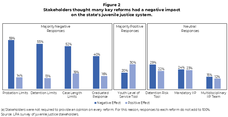 - Figure 2 summarizes overall stakeholders’ responses on the eight key reforms. As the figure shows, between 52% and 59% of all respondents said the three new time limits had a negative effect on the juvenile justice system. For example, 59% of respondents thought probation limits had a negative effect on the juvenile justice system. Conversely, 14% thought it had a positive effect. The remaining 27% did not select probation limits as having a positive or negative effect on the system.