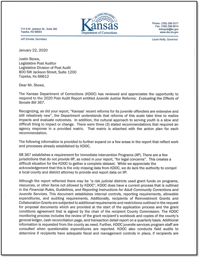 On January 8, 2020 we provided the draft audit report to the Kansas Department of Corrections and the Office of Judicial Administration. Their responses are below.