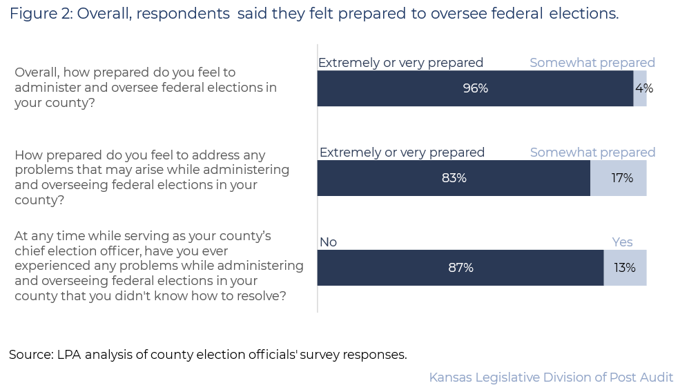 - Figure 2 shows survey responses related to whether respondents felt prepared to oversee federal elections. As the figure shows, 73 of 76 (96%) said they felt extremely or very prepared. But 13 (17%) said they felt only somewhat prepared to address problems that may arise during elections. 10 (13%) others said they’ve experienced a problem they didn’t know how to solve.
