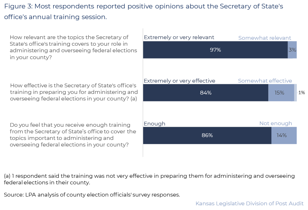 - Figure 3 shows survey responses related to the Secretary of State’s office’s annual training session. As the figure shows, 71 of 73 (97%) who reported receiving this annual training said it covered topics extremely or very relevant to overseeing elections. But 11 (15%) said this training was only somewhat effective, and 1 said it wasn’t very effective.