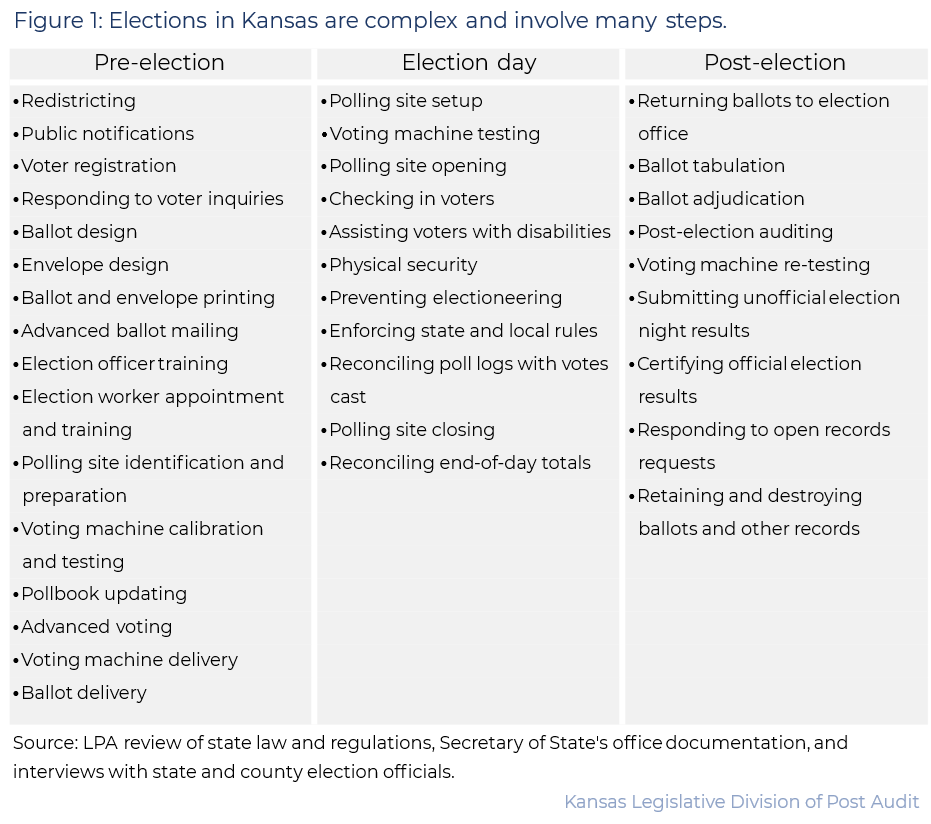 Elections are complex processes, and Kansas has many statutes related to their administration and oversight. For this report, we didn’t review them all. Instead, we were directed to focus on 3 specific aspects of the election process. State law was either silent or high level in all 3 areas. County officials run elections, and the counties we reviewed handled things differently in some areas. Whether election processes should be more uniform statewide is a policy decision for the Legislature. Some states we reviewed had more detail and clarity in areas such as digital ballot copies and training, whereas others were more like Kansas.