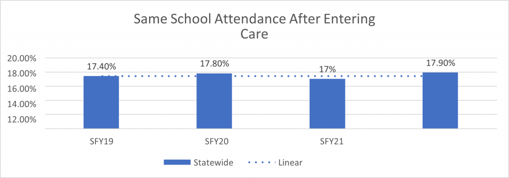 - The federal Children’s Bureau and state grant agreements require states meet certain safety, well-being, and permanency outcomes for children in foster care. These include standards for the number of children in foster care who remain in the same school and are placed with siblings or kin.