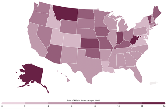 Kansas has the highest rate of children in foster care in the entire Midwest and one of the highest rates in the nation. The map below from Casey Family Program shows the problem: