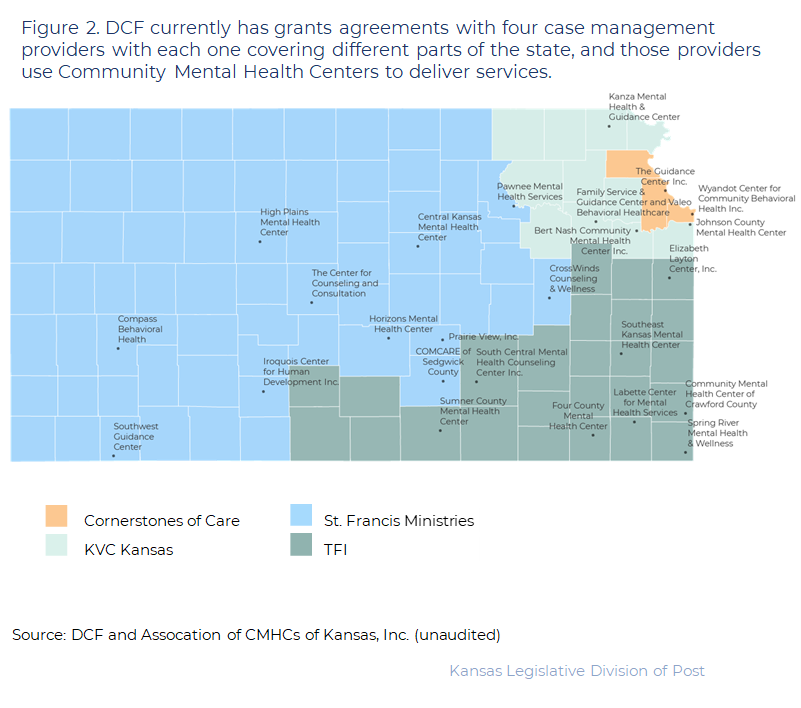 - DCF currently has grant agreements with 4 case management providers for foster care services: St. Francis Ministries, KVC Kansas, TFI, and Cornerstones of Care. As Figure 2 shows, each case management provider covers different regions of the state. The current grants began in October 2019 and will expire in June 2023. We collectively refer to the 4 organizations with grants as case management providers throughout this report. However, individual performance of the organizations may vary in the areas discussed.