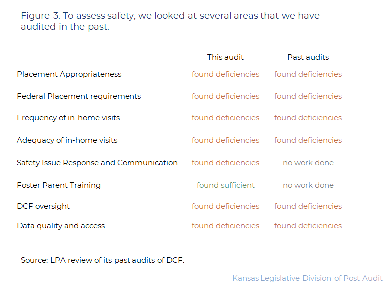 - LPA has conducted audits on child safety in the foster care system in 2016, 2017, and 2020. In those audits, we identified some issues with both DCF policies and performance. Those issues were related to things like the placement decision process, frequency and adequacy of monthly visits and safety monitoring, performance on federal safety and placement standards, and DCF monitoring of case management providers.