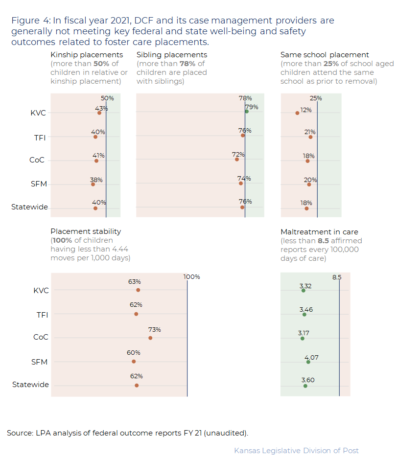 - Kansas exceeds the federal performance standard for ensuring the safety of children in foster care. While there are multiple safety metrics in the federal Children’s Bureau Child and Family Services Reviews (CFSRs), a top metric is the rate of maltreatment in foster care. This means that children who enter foster care are kept safe during their time in state custody, rather than being harmed again. DCF and all four private, nonprofit case management providers are exceeding the federal standard. As Figure 4 in the LPA report shows, children served by the four providers experience maltreatment at less than half the federal performance standard of 8.5 victimizations per 100,000 days in foster care. In other words, it can be said that the Kansas foster care system is keeping children safe.
