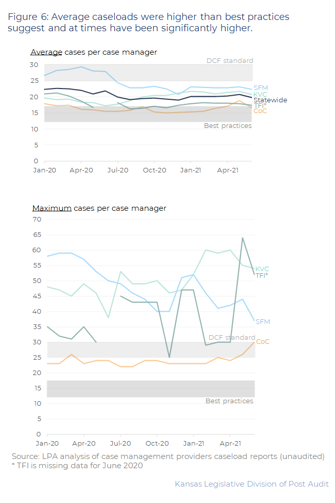 The audit performance report reflects that “caseloads for case workers were higher across the state than best practices recommend” and goes on to state, “best practices varied, but generally were between 12 to 18 children in foster care per case worker”. Although it might be challenging to definitively deduce our average caseload size during the review period based on Figure 6 in the report, our average caseload size per case manager was 13.5 children.