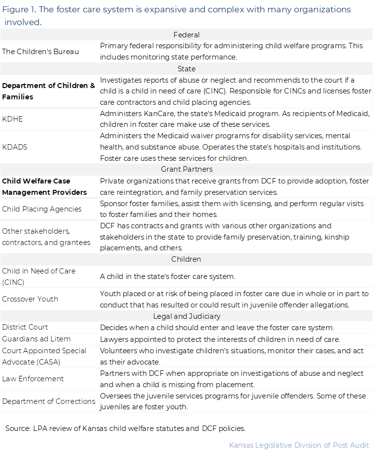 - Figure 1 summarizes key entities and groups involved in the state’s foster care system and their roles. In this audit we focused on DCF and the case management providers.