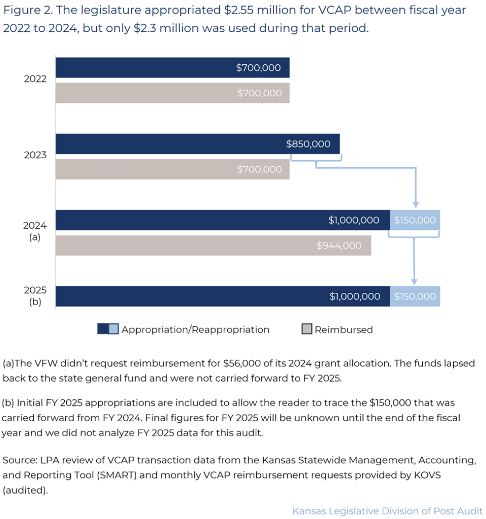 - Additionally, KOVS officials appeared to have made an error on the fiscal year 2025 VCAP contracts that resulted in veteran service organizations being allocated less funds than they should have been. The Legislature appropriated $1.15 million to KOVS for VCAP grant funds at the beginning of fiscal year 2025. But KOVS only allocated $1 million ($500,000 each) to the organizations. KOVS is not required by statute to distribute all appropriated grant funds each year. Yet, KOVS told us that this was a mistake, and that the grants should have been larger.