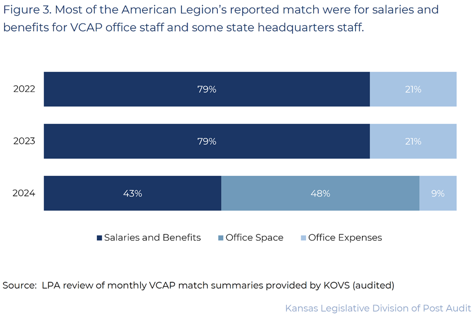 The Kansas Office of Veterans Services has allowed the two participating veteran service organizations to take fundamentally different approaches to reporting VCAP matching obligations, which may or may not comply with state law.