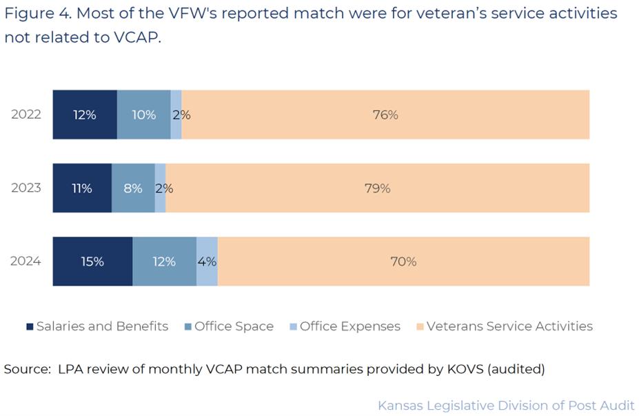 - This practice seems contrary to state law (K.S.A. 73-1234) which requires matching support to be in support of VCAP. VFW officials told us they do this because it’s their understanding that any veterans service activity can be matching support regardless of its connection to VCAP. They told us that they were advised of this by previous agency officials. But, neither the VFW nor KOVS was able to provide documentation of this guidance.