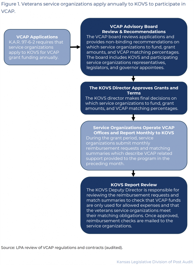 K.S.A. 73-1234(a) states the purpose of the VCAP which is “to improve the coordination of veterans benefits counseling in Kansas to maximize the effective and efficient use of taxpayer dollars and to ensure that every veteran is served and receives claims counseling and assistance.” The advocacy efforts by the grant participants are particularly important for building trust and confidence not only in the VCAP veterans service organizations (VSOs) but also the Kansas Office of Veterans Services (KOVS) and services that are provided to Veterans in Kansas. These relationships resulted in the total amount disbursed to grant participants being approximately $2.3 million during the period covered in this audit. This was used, in part, to fund the American Legion and Veterans of Foreign Wars (VFW) activities directly supporting Veterans and their family members. This included advocacy efforts at three Department of Veterans Affairs (VA) Medical Centers in Leavenworth, Topeka, and Wichita, as well as the VA’s Wichita Regional Office. During the same timeframe, these two grant participants were responsible for helping Veterans receive almost $600 million in direct benefits from the federal VA.