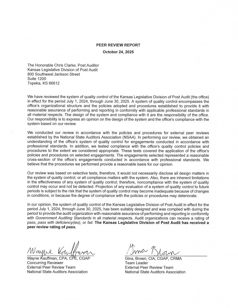 Our office contracts with the National Association of State Auditors, Comptrollers, and Treasurers (NASACT) for our triennial peer review. Our most recent peer review was completed in October 2025, and we received the highest rating possible. Below is a copy of the October 2025 peer review report.